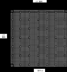 QR码符号共有40种规格,分别为版本1、版本2、…、版本40。版本1 的规格为21模块×21模块,版本2为25模块×25模块。以此类推,每一个版本符号比前一个版本每边增加4个模块,直到版本40,规格为177模块×177模块。以下图分别为版本1,2,6,7,14,21和40的符号结构。