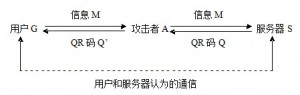 假设用户购买电子票据所需信息M发送给服务器S,但是消息被攻击者A拦截下来,攻击者将发送信息M拷贝并转发给S,S处理后将有效的QR码信息Q回复给A,A获得消息后将错误的Q’信息发送给G。而用户和服务器两端则认为在对方直接通话,但事实上整个过程已经攻击者控制。特别是在用户随意使用未知来源的无线接入点时,这种攻击更易实现。